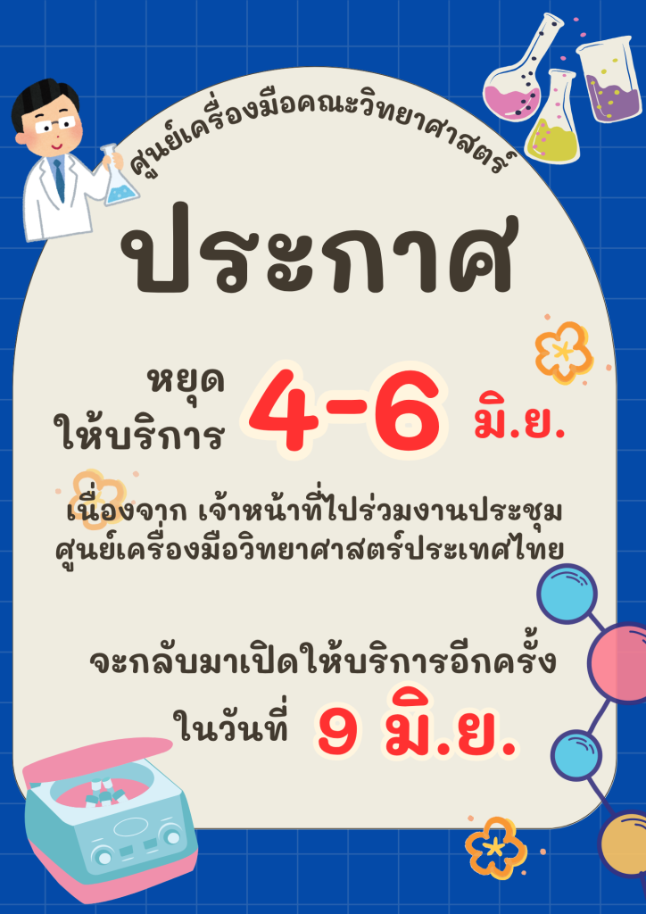 - ประกาศศูนย์เครื่องมือคณะวิทยาศาสตร์ หยุดให้บริการวันที่ 4-6 มิถุนายน 2568