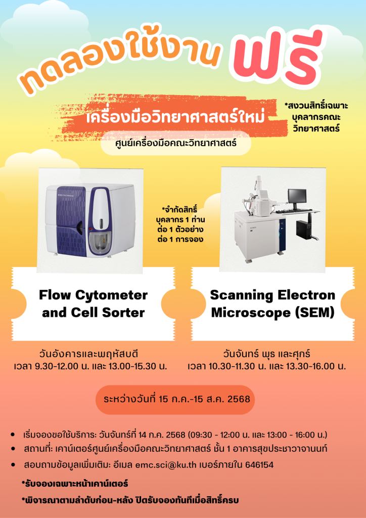 ด้วยศูนย์เครื่องมือคณะวิทยาศาสตร์ มหาวิทยาลัยเกษตรศาสตร์ ได้รับจัดสรรเครื่องมือวิทยาศาสตร์ใหม่ได้แก่ Flow Cytometer and Cell Sorter (FACSMelody) และ Scanning Electron Microscope (SEM) HITACHI รุ่น SU3800 ทางศูนย์เครื่องมือคณะวิทยาศาสตร์จึงเปิดให้ทดลองใช้เครื่องมือดังกล่าวเป็นระยะเวลา 1 เดือน โดยไม่มี ค่าใช้จ่าย เฉพาะบุคลากรภายในคณะวิทยาศาสตร์เท่านั้น ตั้งแต่วันที่ 15 กรกฎาคม 2568 ถึง 15 สิงหาคม 2568