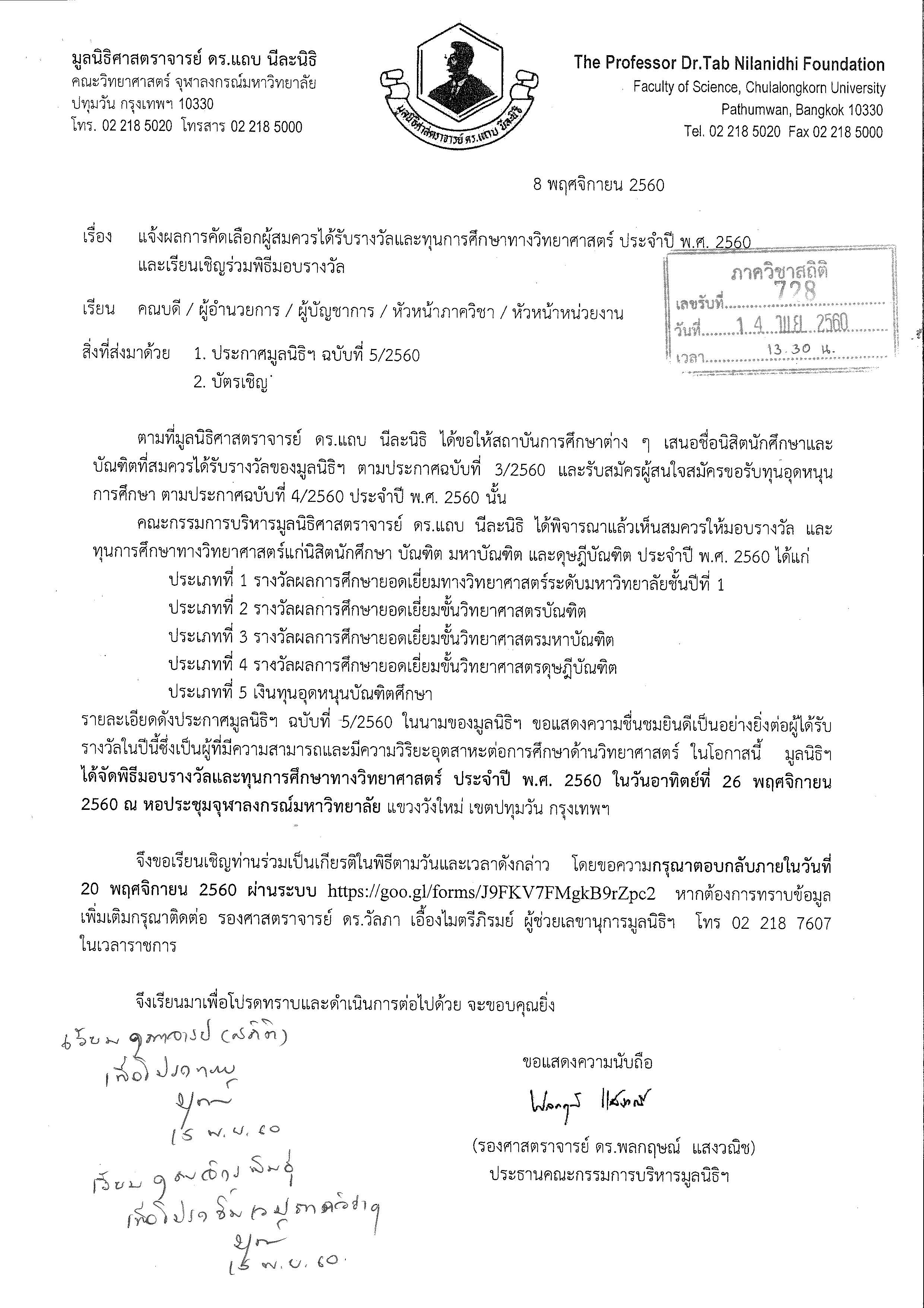 ขอแสดงความยินดีกับบัณฑิตที่ได้รับรางวัลมูลนิธิ ดร.แถบ นีละนิธิ ประจำปี 2560